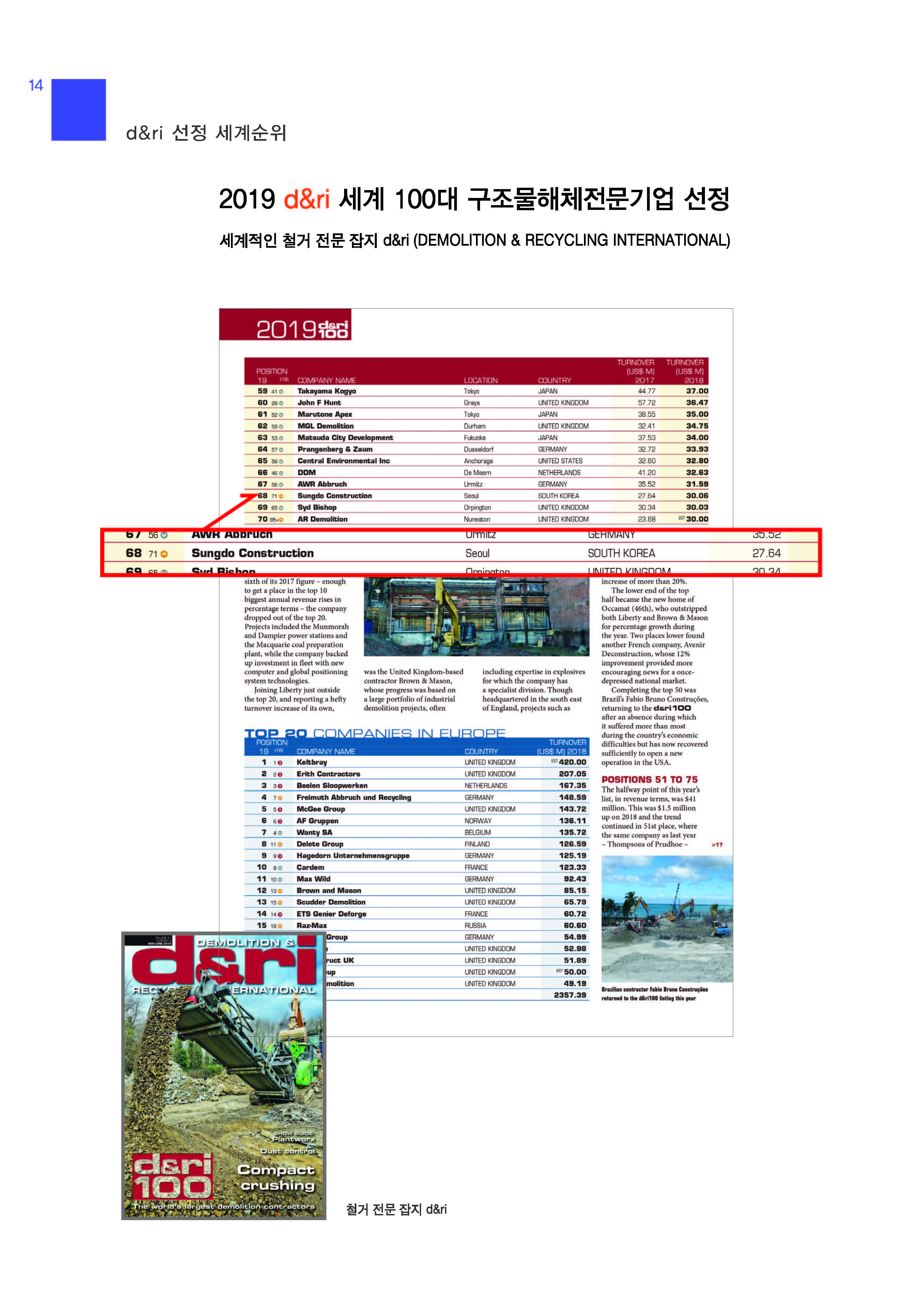 2019 d&ri 세계100대구조물철거회사 68위