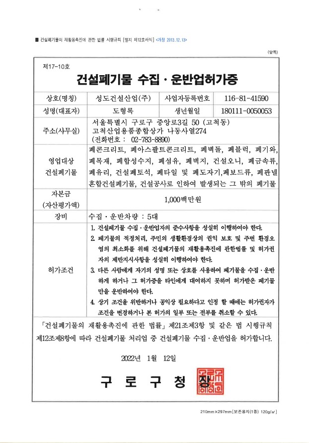 건설폐기물 수집운반 허가증