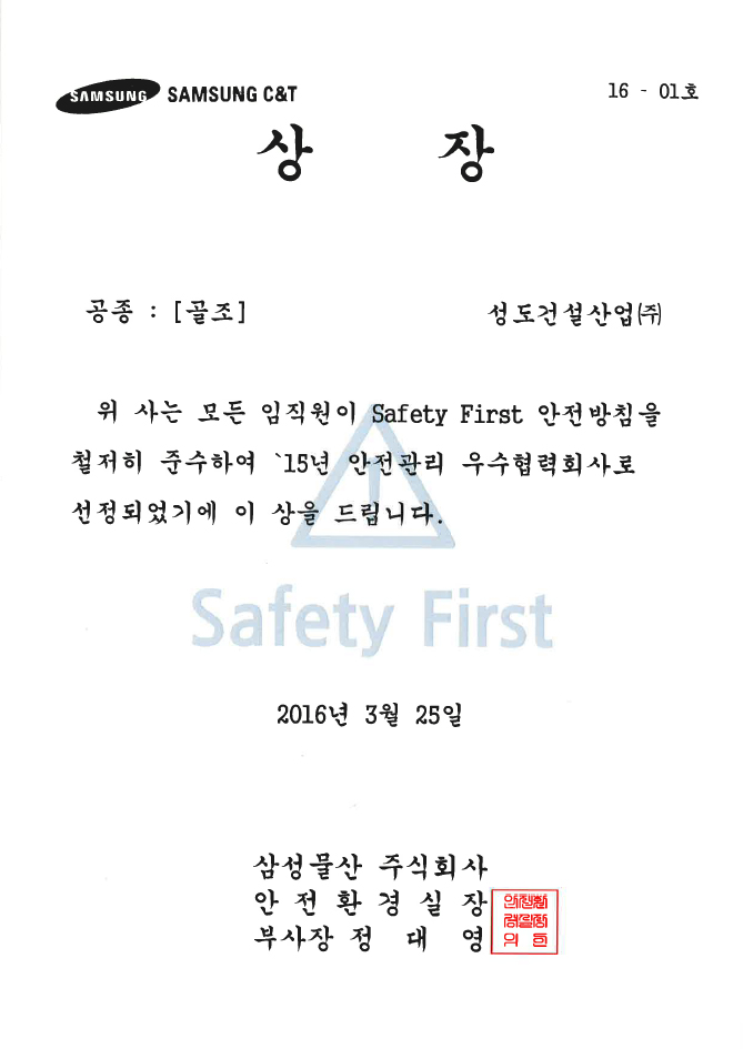 당사는 2016년 3월 25일 삼성물산㈜ ‘15년 안전관리 우수협력회사(건축공종)로 선정되어 수상하였습니다.