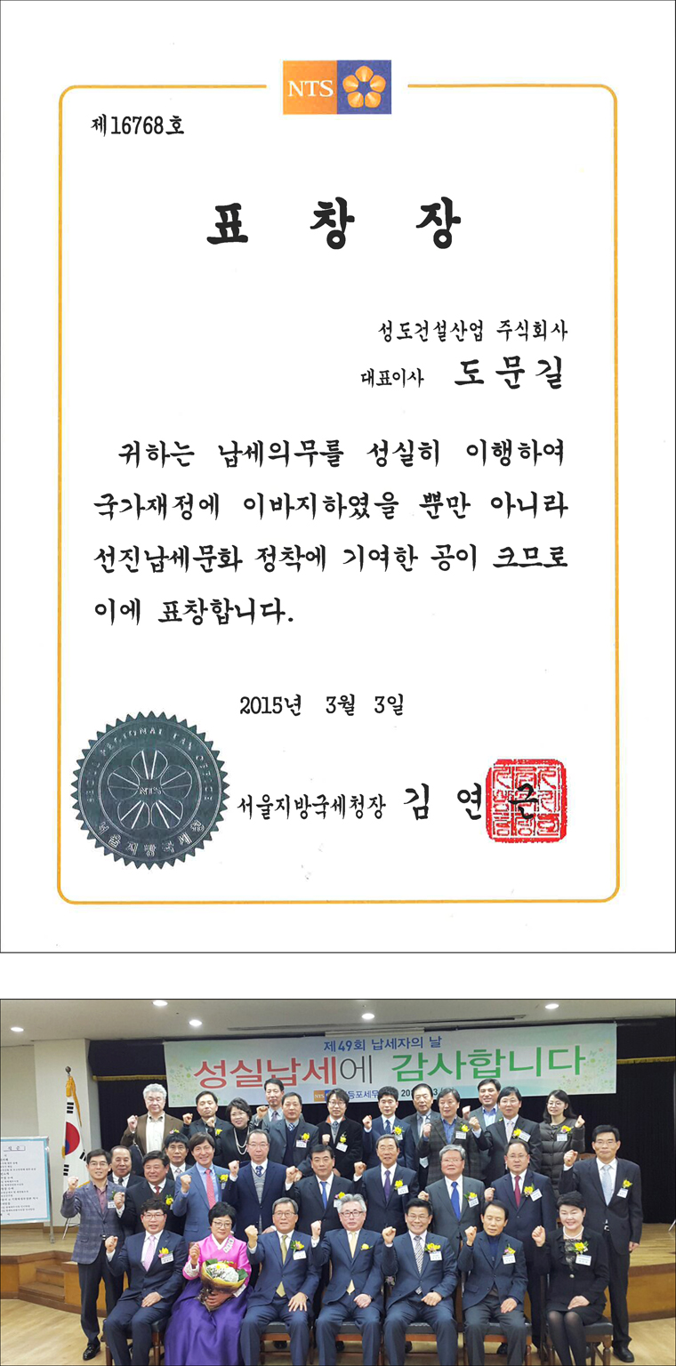 2015년 3월 3일 서울지방국세청으로부터 모범납세기업 표창장을 수여받았습니다.