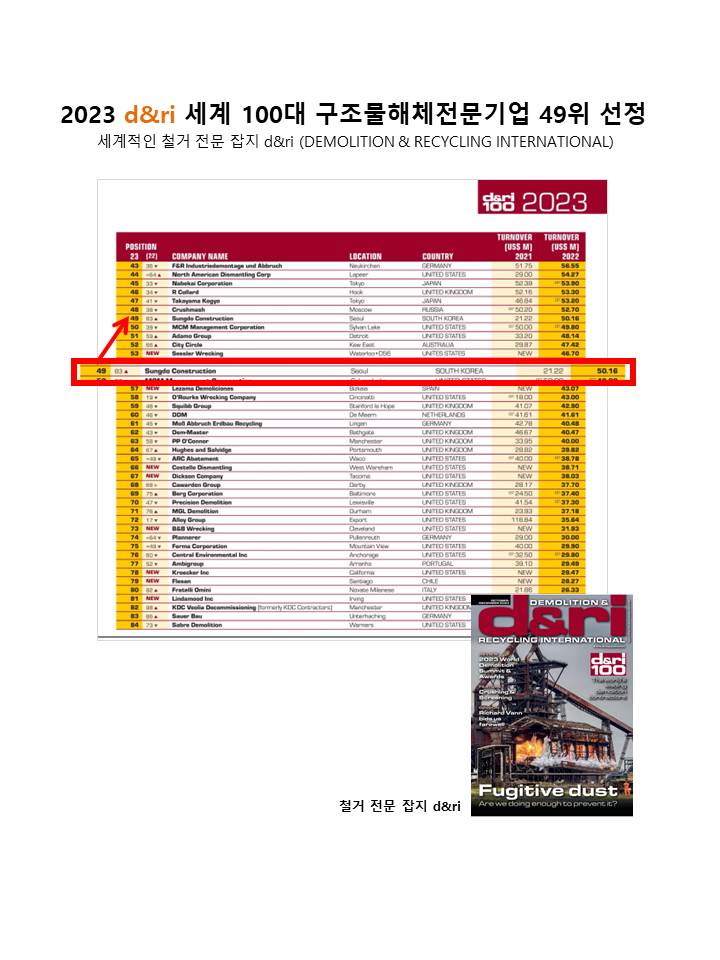 2023년 해체전문잡지 D&RI 선정 100대 세계구조물해체기업 49위에 선정되었습니다.