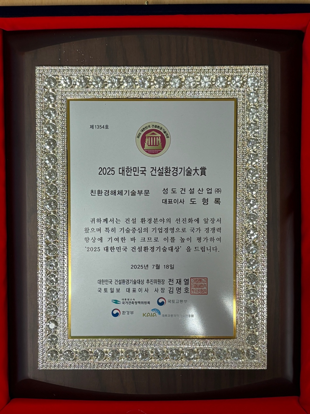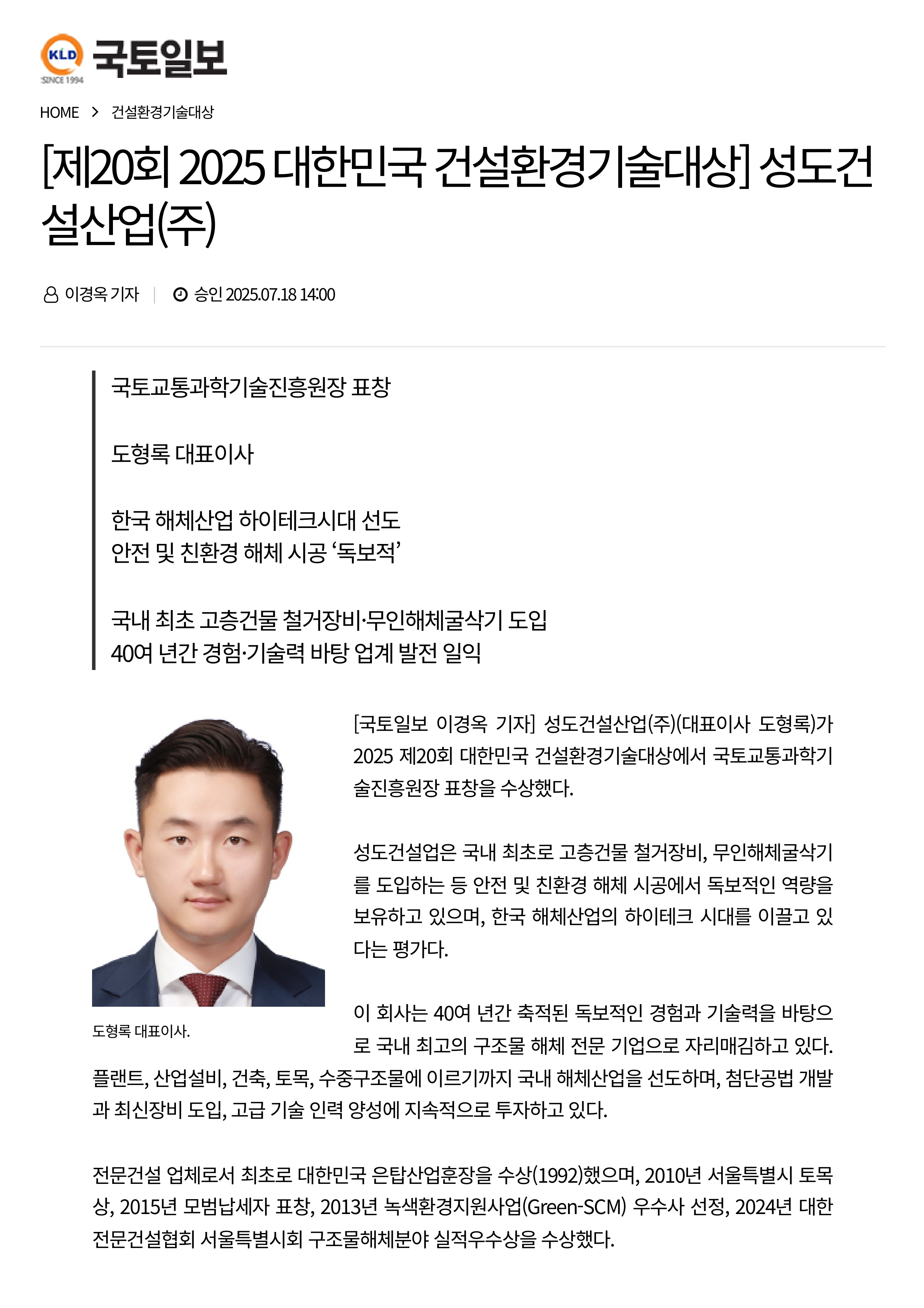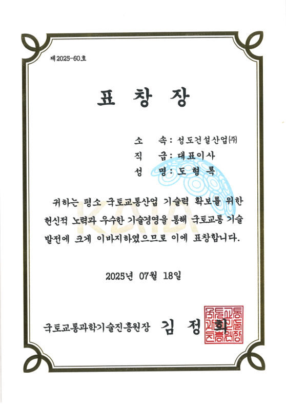 한국 해체 산업의 하이테크 시대를 이끌고 있다는 평가를 받아 2025 대한민국 건설환경기술대상에서 국토교통과학기술진흥원장 표창을 수상했습니다.