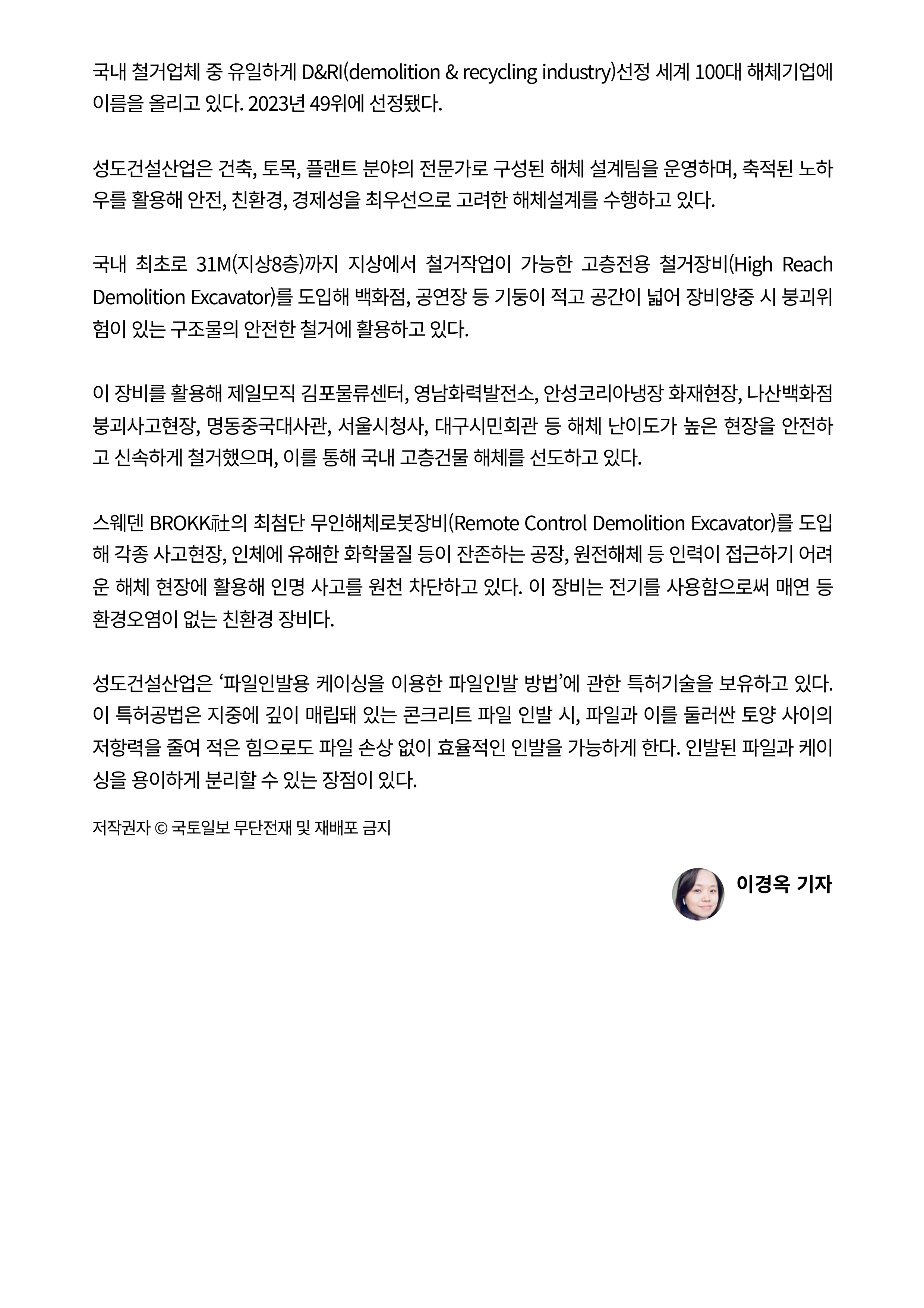 당사는 국내 최초로 고층건물 철거장비, 무인해체 굴삭기를 도입하는 등 안전 및 친환경 해체 시공에서 독보적인 역량을 보유하고 있으며 ,